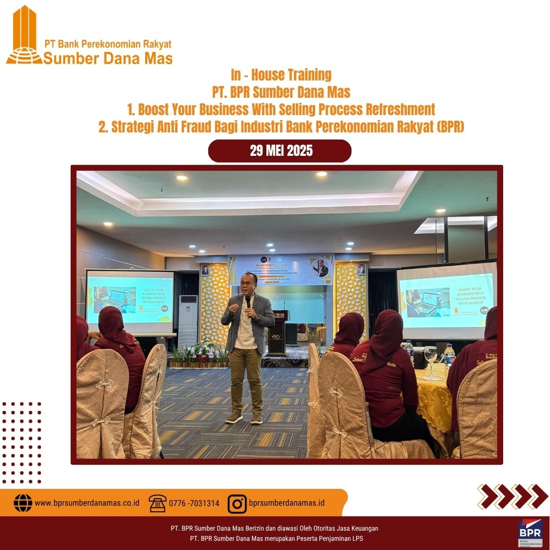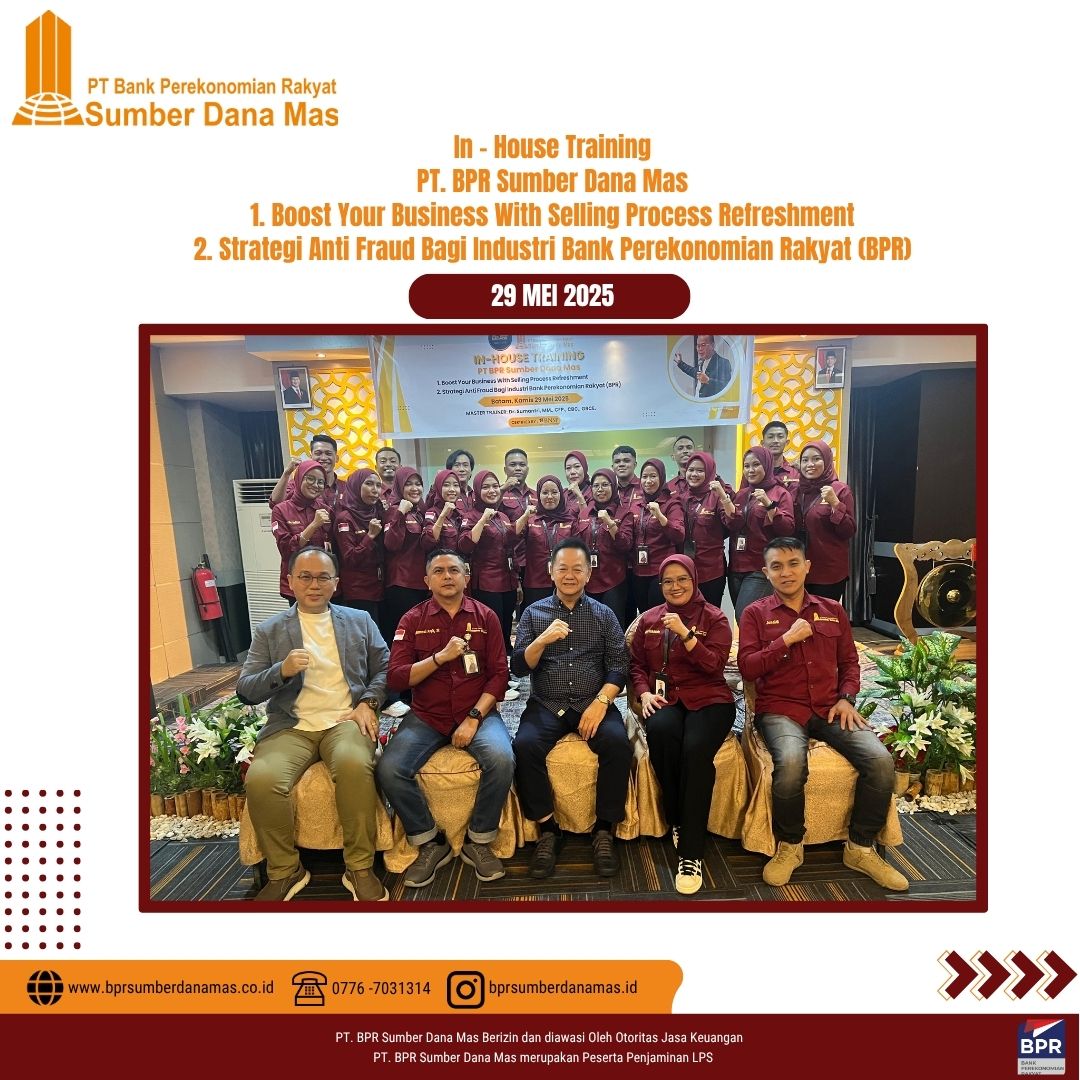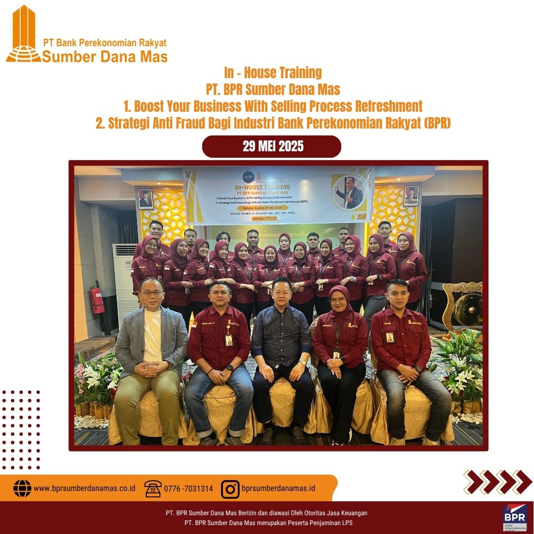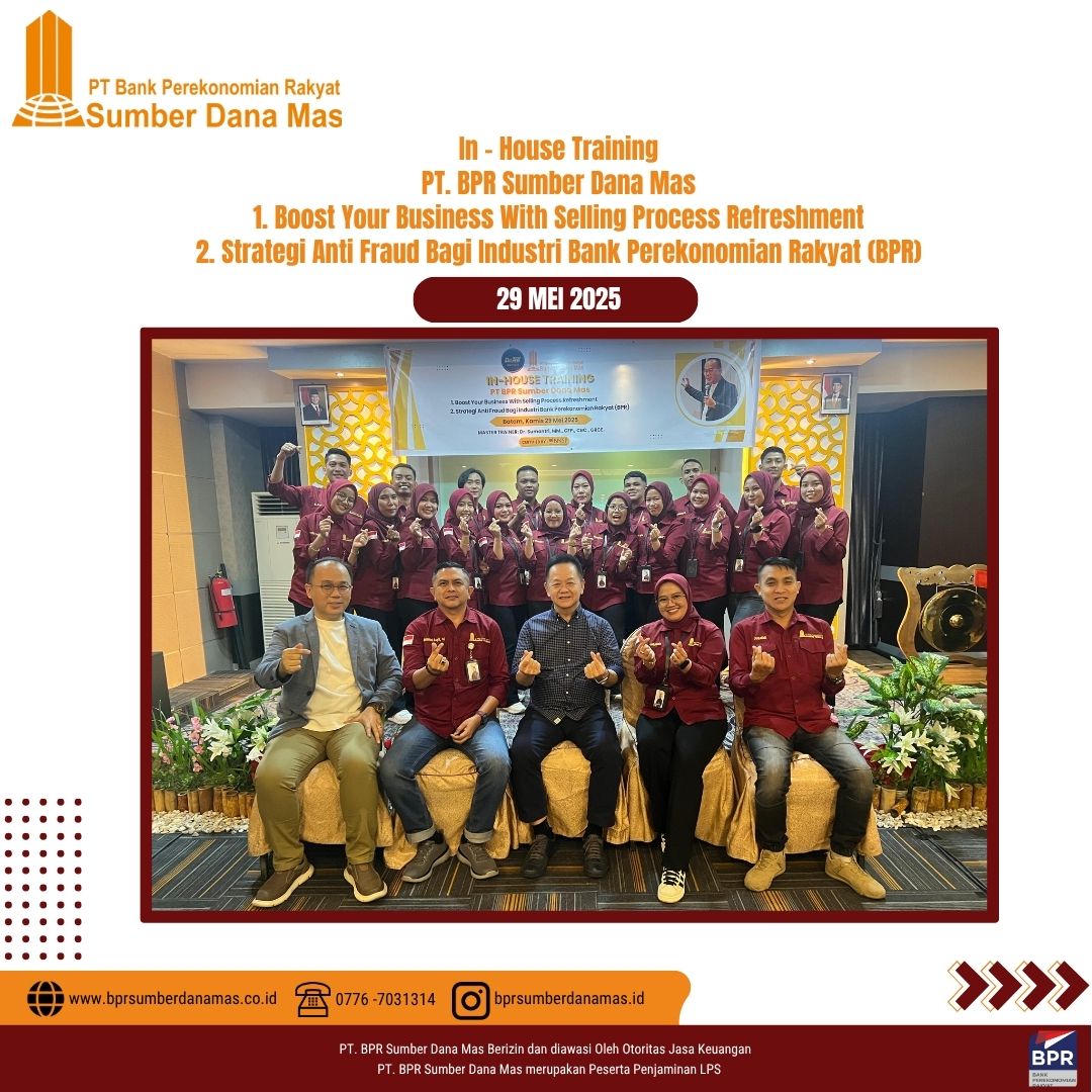 Sebagai bagian dari komitmen dalam meningkatkan kualitas pelayanan dan kepatuhan terhadap regulasi, PT BPR Sumber Dana Mas menyelenggarakan In House Training bertema Strategi Anti Fraud Bagi Industri Bank Perekonomian Rakyat (BPR) & Boost Your Business With Selling Process Refreshment, yang dilaksanakan di Batam, Kamis 29 Juni 2025.