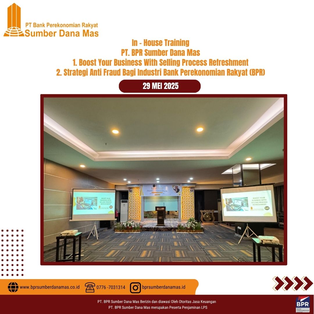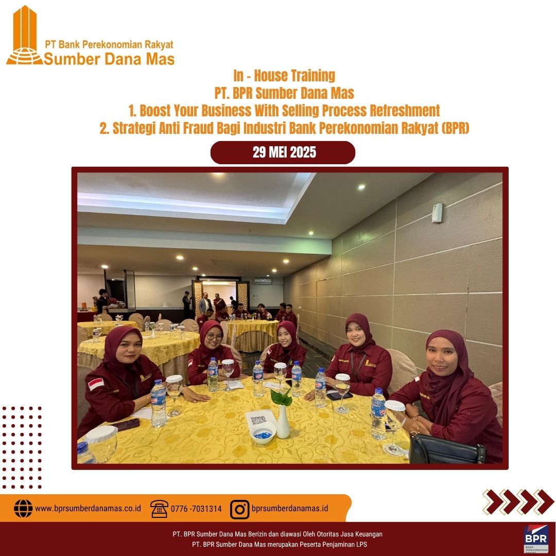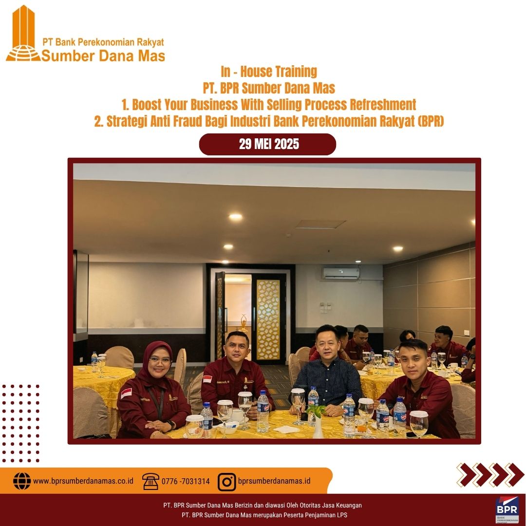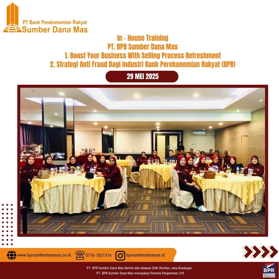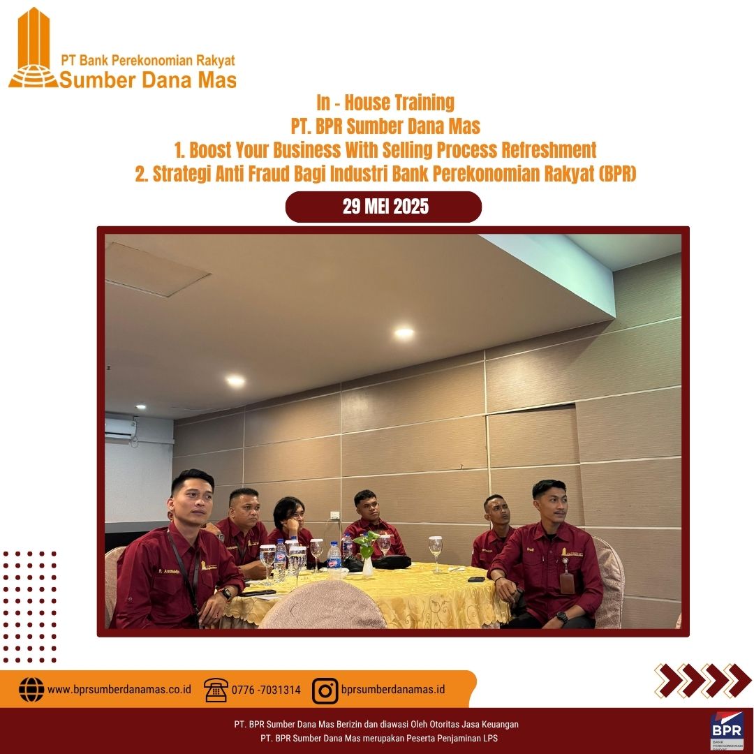 Sebagai bagian dari komitmen dalam meningkatkan kualitas pelayanan dan kepatuhan terhadap regulasi, PT BPR Sumber Dana Mas menyelenggarakan In House Training bertema Strategi Anti Fraud Bagi Industri Bank Perekonomian Rakyat (BPR) & Boost Your Business With Selling Process Refreshment, yang dilaksanakan di Batam, Kamis 29 Juni 2025.