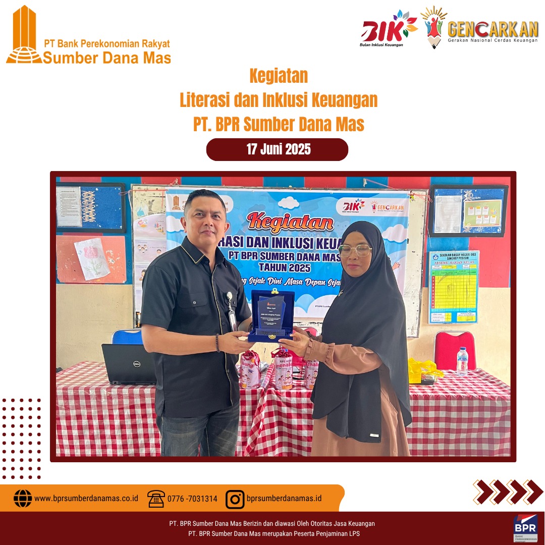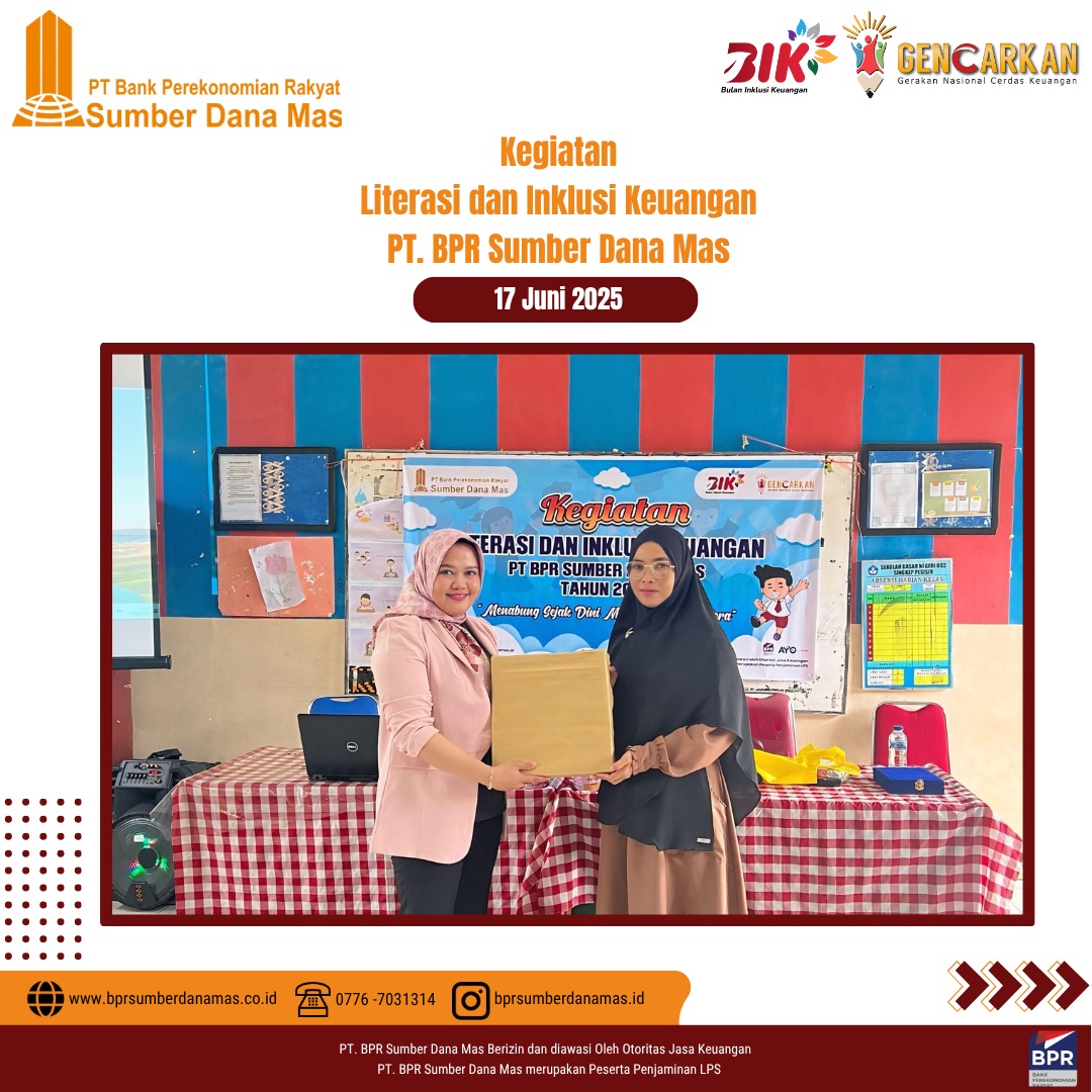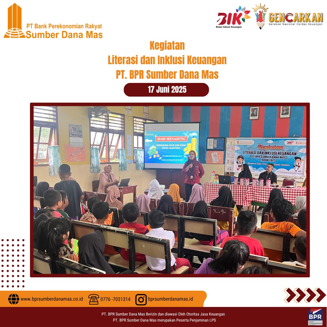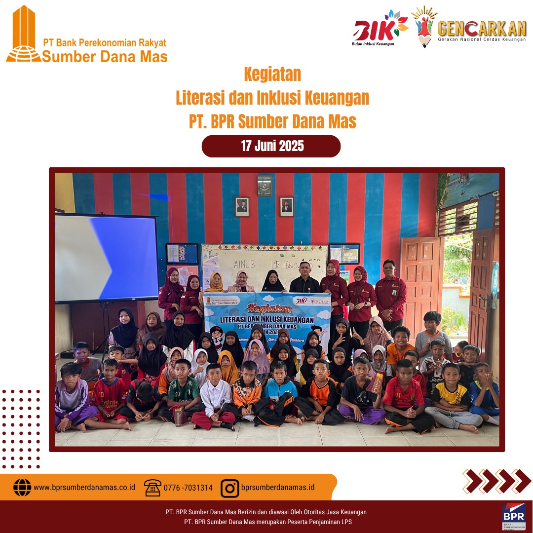 PT BPR Sumber Dana Mas hadir di SDN 003 Singkep Pesisir dalam kegiatan edukasi dan inklusi keuangan untuk siswa-siswi sekolah dasar. Disini anak-anak diajak belajar pentingnya menabung sejak dini dan mengelola uang jajan dengan bijak serta menumbuhkan semangat kemandirian finansial sejak usia dini.
