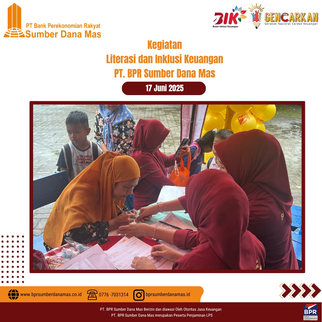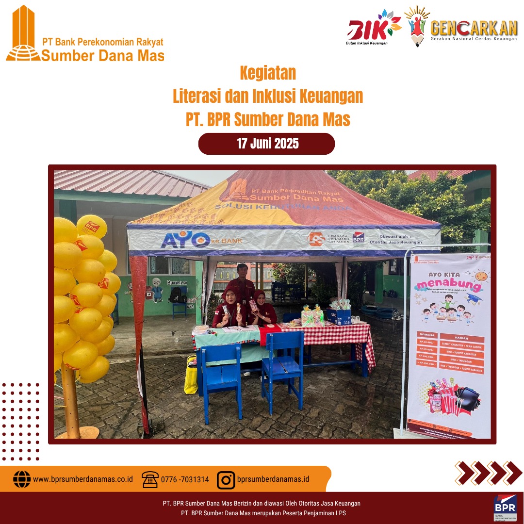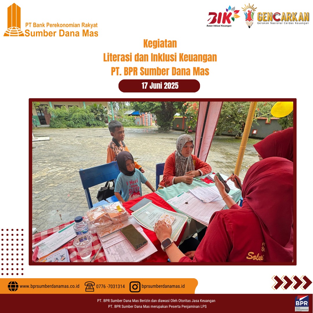 PT BPR Sumber Dana Mas hadir di SDN 003 Singkep Pesisir dalam kegiatan edukasi dan inklusi keuangan untuk siswa-siswi sekolah dasar. Disini anak-anak diajak belajar pentingnya menabung sejak dini dan mengelola uang jajan dengan bijak serta menumbuhkan semangat kemandirian finansial sejak usia dini.